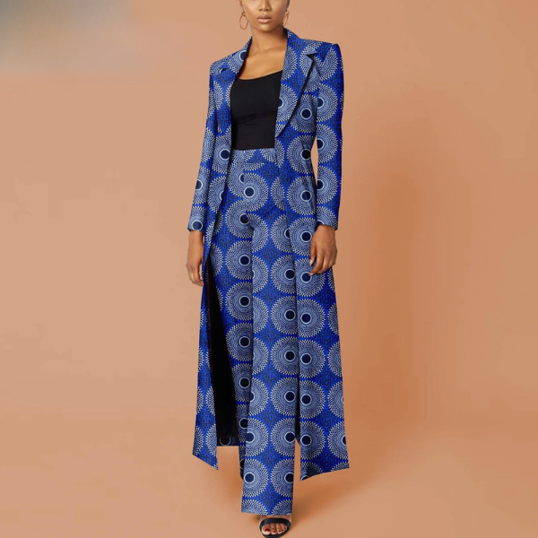 Stylish African women’s 2-piece suit set with Ankara print long sleeve jacket, perfect for office, business, and smart casual wear.